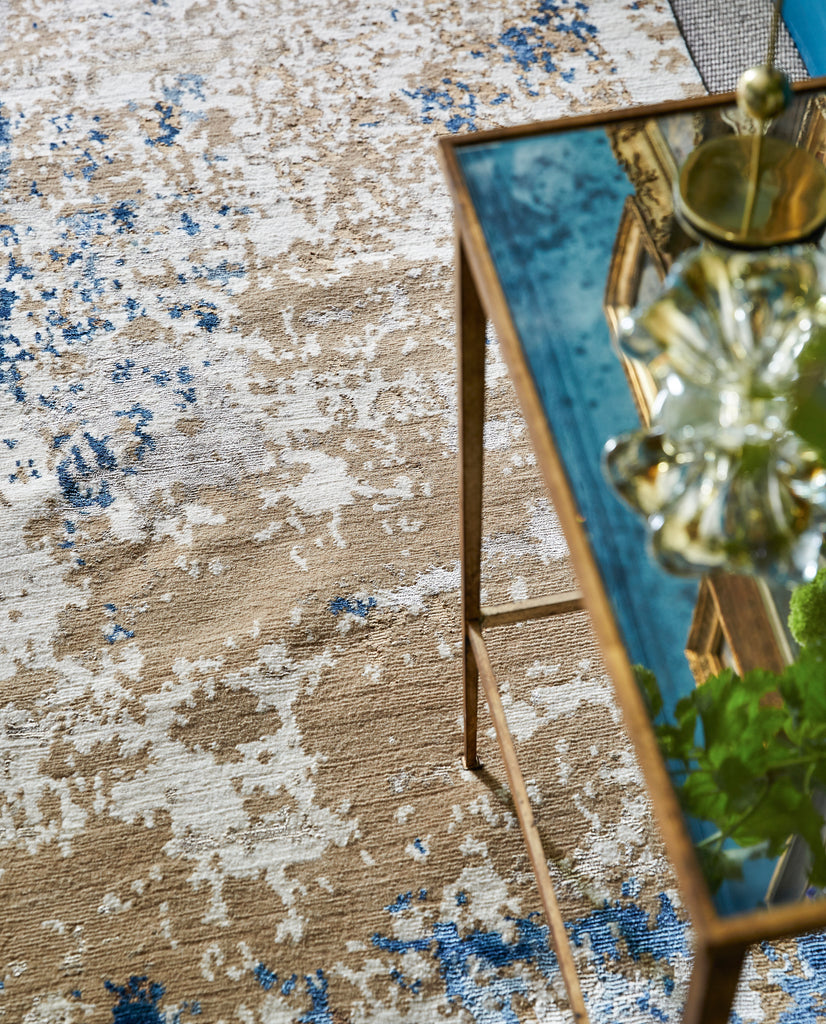 The gentle diffusion of rich blues and muted coppers, crafted in wool and bamboo silk, celebrate the dynamic rock crystal formations commonly found in Kentucky, Jennifer Manners’ home state.