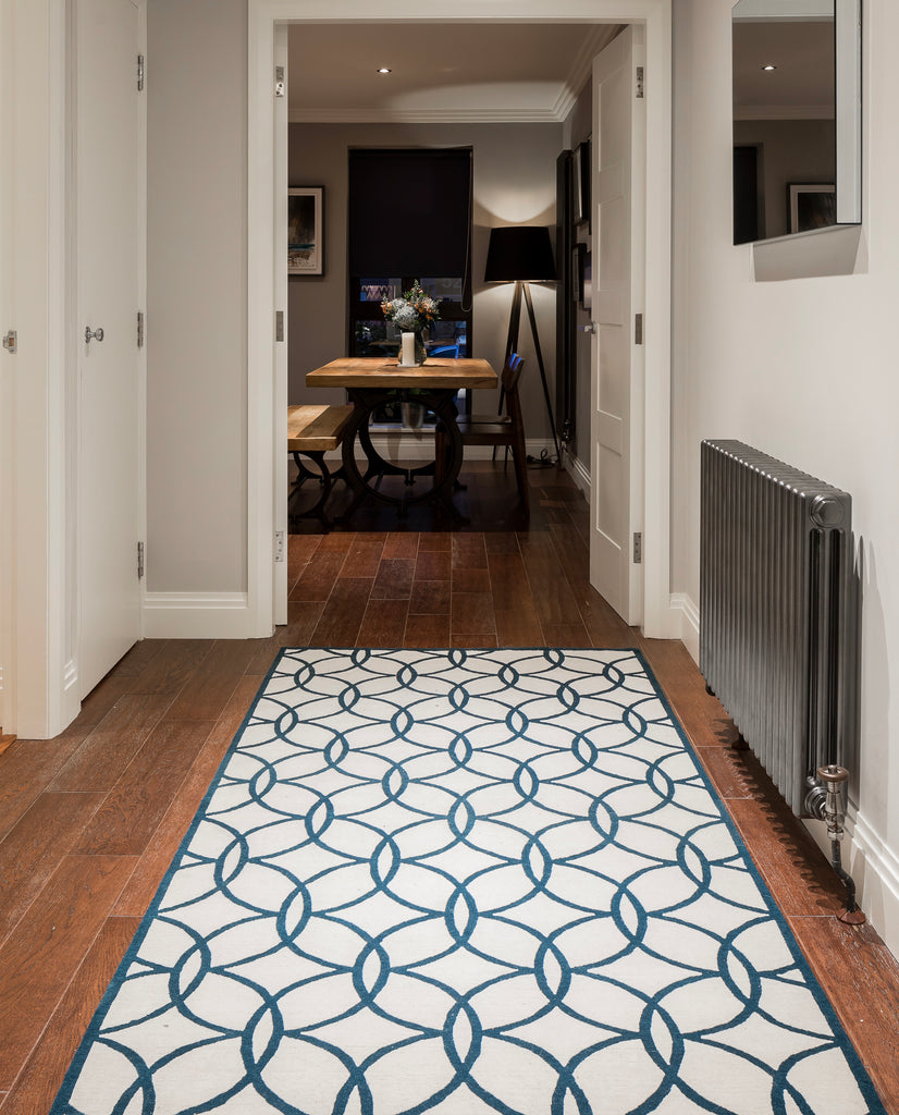 Tiles fuses a traditional chainlink design with angular diamond shapes to create an elegant rug that will complement any scheme.