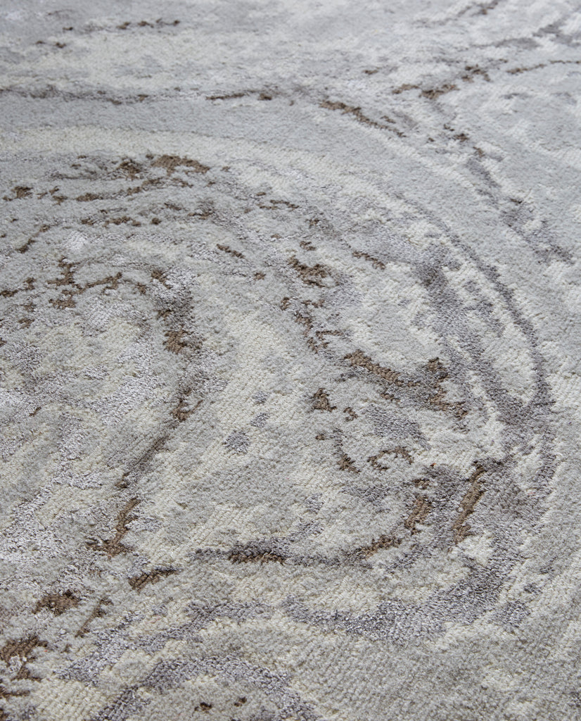The fluid patterns found in the travertine stone have been interpreted here in soft Himalayan wool and lustrous bamboo silk. Rendered almost entirely in muted colours, the design is illuminated by metallic flecks of bronze and silver that bring dimension to the rug.